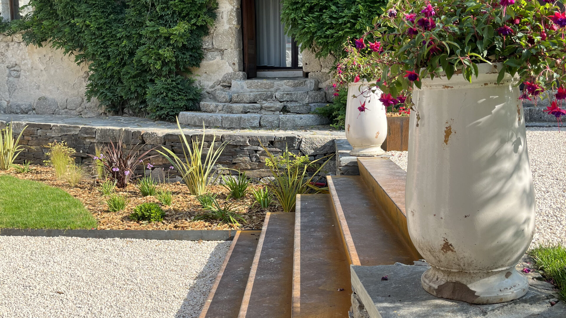 Un sol en gravier perméable Eccogravel et un escalier en corten signent une entrée à la fois moderne et authentique.
